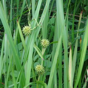 ミクリ(実栗) ガマ科ミクリ属 湾処の奥を覗いて見ると イガイガの実が見えました 雄花の終わった分枝した柄も見えます ミクリで良いようです 草高2m 葉の根元は三角形 柔らかくスポンジ状で水に浮く 花の無い時期はガマと見分けが付かない 同じ花茎に雌花と雄花が付く 上部の分枝した所には雄花の頭状花序 下には雌花の頭状花序が無柄で付く 花後に2〜3cmのイガグリ状の果実ができる 東京都: 絶滅危惧Ⅱ類(VU) 北多摩: 準絶滅危惧(NT)