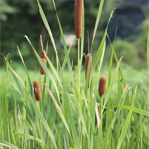 8月13日 今日のお花 🌿🌿🤎 ガマ 🤎🌿🌿 穂の形がユニークで、花材にも使われる。 ソーセージ状に目立つ部分が「雌小穂」と呼ばれる雌花の集まりで、その上につく細いものが「雄小穂」と呼ばれる雄花の集まりです。 湖沼や河川のヘリ、湿地にごく普通に生える大型の多年草です。 別名 御簾草、狐の蝋燭 花期 夏 生息地 水辺
