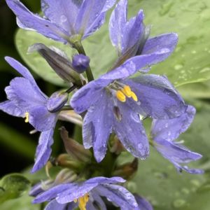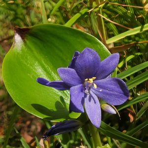 ミズアオイ(水葵) *ミズアオイ科ミズアオイ属 花期は8〜10月 北海道〜九州の水田.池沼などの湿地帯に生育する抽水植物の一年草! 高さは30〜70cm 葉は質が厚く光沢があり心形で全縁! 花は1日花で葉より高い位置に総状花序を出す!(似たコナギは花序が葉の下) 青紫色で花被片6個! ・抽水植物 根は水底の土壌中にあり葉や茎が 水面から出ている植物 ここは去年見た沼ですが、去年の大群落は6月の大雨で株が流されてその後、タニシの被害でほとんどが消えたそうです! ですが近くの別の池に新たに群落が現れました。 作業中の方に植栽かと尋ねてみると、自生だそうです! 生き延びるための植物達の意思のようなものを感じて驚きました❗️ 9月4日撮影 宮城県 登米市
