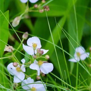 ① シロバナサクラタデ/白花桜蓼 タデ科 イヌタデ属 原産地:在来種(日本全土) ・山野草 ・多年草 ・草丈・50-100cm ・花期:8-10月 ・花序:穂状で長く、その先は垂れ下がる ・花径:4mm ・花被:長さ3-4mm、白色、5裂まれに4裂し、腺点がある ・花:異形花柱性 (短花柱花と長花柱花の2形) ・短花柱花:雌しべの長さ約2.4mm、雄しべの長さ4.3mm、雄しべが花被より突き出る ・長花柱花:雌しべの長さ約4.3mm、雄しべの長さ約2.4mm、雌しべが花被から突き出る ・雄しべ:6個まれに7~8個 ・花柱:2まれに3分岐する ・果実:痩果 長さ約2.5mm、レンズ形が多く、3稜形が混じり、黒色、光沢がある ・別名:コサクラタデ、ヒメサクラタデ 花言葉:「優雅な清楚さ」、「愛くるしい」、「幸運」、「幸運が来る」 ② ガガブタ/鏡蓋 ミツガシワ科 アサザ属 原産地:日本、東南アジア ・抽水植物 ・多年草 ・一日花 ・花期:7-9月 ・花径:約1.5cm ・果実:さく果 楕円形で 長さ4-5mm ・種子:広楕円形で光沢があり、長さ0.8mm ・別名:オトコジュンサイ、イカリモ、金銀蓮花、白花荇菜、印度荇菜、和製バナナプラント、ニンフォイデス・インディカ 花言葉:「心の純潔」「純情」「信頼」 ·͜·ᰔᩚ 初めまして ※ 環境省レッドリスト 準絶滅危惧 (NT) ③ ナガバオモダカ/長葉面高 オモダカ科 オモダカ属 原産地:USA(フロリダ州、ノースカロライナ州、サウスカロライナ州、バージニア州) ・雌雄同体(雌雄異株もある) ・雌雄異花 ※ 日本で野生化が確認されているのは、雌花だけの雌株 ※ 日本では結実ぜず、走出枝を出して栄養繁殖する ・抽水植物 ・一年草か多年草 ・葉:長さ7-30cm 長い楕円形で葉縁に鋸歯はない ・草丈:20-60(-100)cm ・花期:5-9月 ・花序の上部が雄花、下部が雌花 ・花弁:白で3枚 ・花径:1-1.5cm ・花序:円錐花序 ・別名:ジャイアント・サジタリア 花言葉:「高潔」 ※ 外来生物法により要注意外来生物に指定されている ·͜·ᰔᩚ初めまして ④ ヌマトラノオ/沼虎の尾 サクラソウ科 オカトラノオ属 原産地:在来種(本州、四国、九州) ・山野草 ・多年草 ・草丈:40-70cm ・花期:7-8月 ・花:総状花序 長さ10-20cm ・苞:長さ2-3㎜mm ・花柄:苞と同長又はわずかに短い ・花冠:白色、5裂、長さ約3mm、 ・花径:5-6mm(黒色の腺点がある) ・果実:蒴果 球形 ・果径2-2.5mm ・種子:球形 胎座の窪みにはめ込まれ、幅約0.7mm 先がやや丸く低い、円錐状 ・別名:ヌマハギ(沼萩) 花言葉:「協力」 ⑤ ユリ (カサブランカ) 花言葉: 白:「純粋」「無垢」