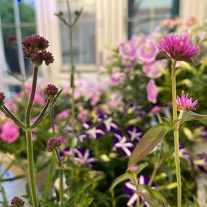 スカビオサがかわいい❤️ 切ってもわりかし長持ちだし。 100均の種のスイートピーもがんばってます。