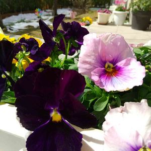 ピンクと紫のパンジー💗💜 紫はベルベット風です✨ 仲良く日光浴中🌞 後ろの方には今朝積もった雪が❄️ 生け垣の下は日陰なので溶けません🖤 もう積もらないと思ったのに油断した~😅