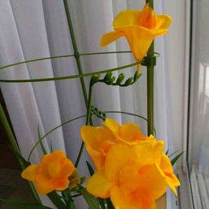 黄色のフリージア💛 蕾が膨らんできました🥰 あと2~3日で咲くかな? 香りが楽しみ~🎵 茎が伸びてきたのであんどん支柱を立てました🪜 ちなみに白は今5つ咲いています✨ 後ろのポインセチアは そろそろ剪定しようかと✂️ 娘の自宅待機期間が終わってからゆっくりね🏫😅