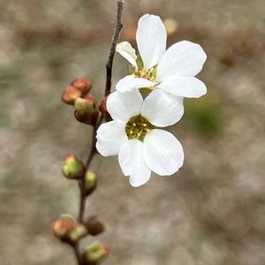 花は 一重小輪 直径2、5cm 花期は 11~12月および4月です。 秋から初冬の気候の変化による、 寒さにより〰︎咲き始めます🎶 冬桜(ふゆざくら) バラ科