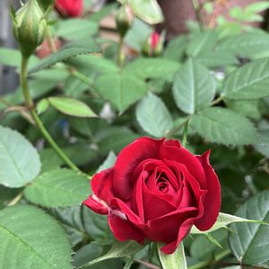 ミニバラ咲き始めました♪🌹 赤とサーモンピンク サーモンピンクのはずなんですが、濃いオレンジに近い色 花びらがもう少し開くのが楽しみです😊