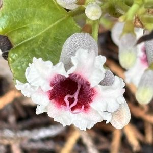 🌱野に咲く花🌱 🌀つる性多年草🌀 中心部が赤紅色の白い小花 白い粒状の毛が密集する④ 葉🌿をもむととても臭い😹 (咲き始めました🎶) 屁糞葛(へくそかずら) 別名 サオトメカズラ ヤイトバナ アカネ科