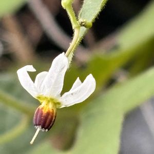 🌱🤍野に咲く花🤍🌱 🌀つる性植物 花は直径約1cm 花は白色で深く5裂し 大きく外に反り返る🎶 花の基部に緑色の斑点がある 鵯上戸(ひよどりじょうご) ナス科🍆 全草有毒植物