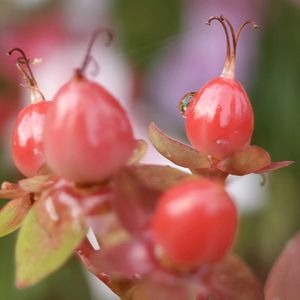 ヒペリカム色々 レッスンで使ったヒペリカム挿し木に この他に小粒ちゃんはまだ苗状態💦 左上から小豆、ピンク、グリーン、赤 元々よりちょっと小さ目 お気に入りは小豆ちゃん🤎 葉の出始めは赤く、蕾も赤い 花はオレンジ掛かり特にシベが🧡 実は艶々🤎 花友ちゃんにあげたのはマットな感じに、🧐