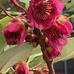 【ロドレイア】《マンサク科》 花言葉 「幸福の再来」「古き伝統」「無事を祈ります」 別名 シャクナゲモドキ 東南アジアや中国南部が原産の 常緑の小高木で、 シャクナゲに似た花を咲かせる 直径5㎝ほどの大きな花が 枝先に房状に集って下向きに咲く