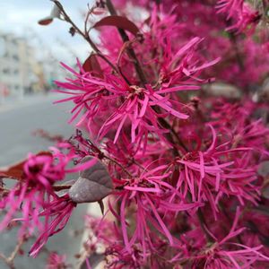 去年商店街の更地に建ったマンションの庭の植栽の花ロドレイアです。 花の付き方や葉・樹姿がシャクナゲに似ているので別名をシャクナゲモドキと呼ばれます。