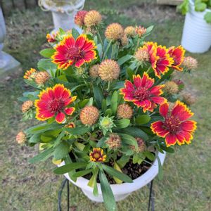 《ガイラルディアスピントップイエロータッチ》 名前が長すぎ〜(笑)🤣 コンパクトな草姿にたくさんの花が咲き、まるでブーケのよう🤗🌸🌼 キク科の花の中でもこのレッドカラーは目を引く🤗🌸