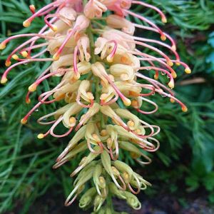 グレビレア サパープ 今年は花付きイイ〜💛🩷 ☔のせいかな?何時もより色鮮やか〜💛💗 トンボが蕾にとまってた〜✨