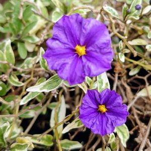 斑入りのソラナムランドネッティです🌿💜 風にそよぐたおやかなつるが涼しげなソラナム。 花色、葉色のバリエーションが豊富です。 この品種はアメジストを彷彿とさせるとびきりの紫青の花弁に、トパーズを思わせるイエローの葯がはいる、色鮮やかな花。 アクセントがきいて存在感があります。葉は斑入りなので、花のない時期もカラーリーフプランツとして楽しめます。 学名:Solanum rantonnetii 'Variegatum' タイプ:ナス科ソラナム属の非耐寒性低木 樹高:1~2m 開花期:6~10月 🏷美しく青きドヨウ