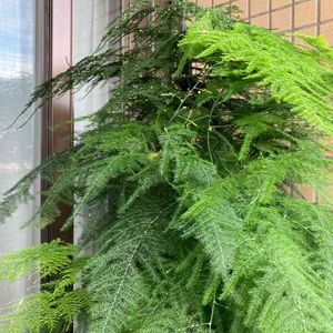 シュルルルン ファッサー お散歩シリーズは 🏷you..その他 ◇以下脳内整理の為の検索引用メモ (150種以上あると言われる観葉アスパラガス) (推測投稿を重ねる事で いつか自分で過去投稿を突っ込める程 見分けられるようになれるかなと妄想) (重複アリ) (今後の考察の為、またダラダラ長文引用) ◇ 花名 シノブボウキ(忍箒) 学名 Asparagus setaceus ‘Nanus’ (アスパラガス・セタケウス ‘ナヌス’) 別名 アスパラガス・セタケウス、 アスパラガス・ナナス、 Asparagus nanus、Asparagus fern、 アスパラガス・プルモーサス・ナヌス Asparagus plumosus var. nanus)、 ナナス 科属 キジカクシ科クサスギカズラ属 シノブボウキ種 原産 園芸品種(南アフリカ) 分類 常緑半蔓性多年草 蔓丈:300~500cm 葉:鱗片状に退化 葉のように見えるもの 細い被針形の葉状枝(仮葉)は円錐形で直立する 雌雄異株 花色:白、花弁数:6 花冠:鐘状漏斗形で先端6裂 花径:0.5~0.7cm 花期:5月~9月、 果実型:液果、果実:球形 果実色:緑→赤熟(秋から冬) 果実径:0.6-0.8cm 用途:観賞植物、切り葉 ◇ 「オオミドリボウキ、プルモーサス」 学名:Asparagus plumosus 」 の矮小変種(園芸品種?) 羊歯に似た枝葉が羽根のようにふんわりと横に広がります 切花に添える緑や寄せ植えに使われます。 観葉植物として切り葉や鉢植えなどで一番よく使われます