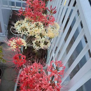 「彼岸花 三色」 東側に置いた、3個のプランターに70個程の花芽が出て来てくれて何本かを残して咲いてます。 ピンクの彼岸花「薩摩美人」 赤の彼岸花「ラジアータ」 白の彼岸花「アルビフローラ」です。 今日が一番綺麗な日になるのかな❔ 台風14号🌀にやられちゃうんだろうな😭