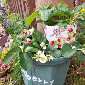 毎月15日はいちごの日🍓に参加しまーす‼️ 4月に入ってから勢い出てきた3種のいちごの花🍓 普段は受粉してもらえるように蜂🐝がよく散歩してるオルレアの近くに置いてます😆