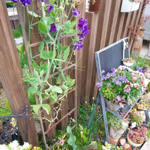 種で繋いだスイートピー咲いてます🎵スイートピーは好きな花の香りベスト5️⃣に入ります😆早速切り花をトイレに😁 グランビオラの寄せ植えもネメシアが盛り返してきて見頃に😍💜 それにしてもこの季節はゴッチャリしたお庭です🤣