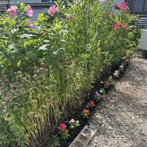 畑の入り口右側の花壇の矢車菊の後のボーダーに、育苗センターから頂いた、日々草を植えました。またこぼれ種から生えてきた松葉ボタンを数株間に植えました。タイタンビカスや西洋芙蓉の下を飾りました。もう少し伸びてくると良くなると期待しています。