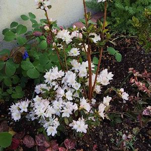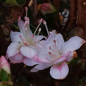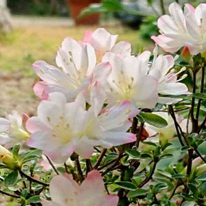 【久留米躑躅】《ツツジ科》 花弁の先の ほんのりピンクが可愛い💕。 クルメツツジは、その名のとおり、江戸時代後期に久留米藩がつくり出した改良品種で、戦後には久留米でたくさん作られたという、日本原産のツツジです。 2021.3.7