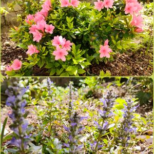 クルメツツジ、直径3cm位の小さな花です。可愛いです🥰 アジュガ、今年は沢山枯れちゃって寂しいです🥲