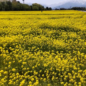 菜花の海 霞んで見える立山連峰をバックに 💛地上からと 💛展望台からの眺め ココは2022に🌷フラワーロードが開催された田圃 砺波の🌷フェア混雑してるみたい