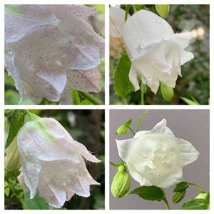 絞り二重咲き ホタルブクロ お待ちどう様🍀 昨日の雨で☂️ 八重咲き蛍袋開きました🍀 真っ白では無いけど ちょっと模様が 今年は沢山咲いてる🍀 花が終わったら鉢増し🍀