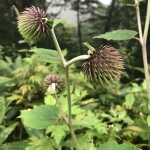 オヤマボクチ(雄山火口) 花期は9〜11月 ゴンパ、ヤマゴンボと呼ぶ地方もあり 草餅のヨモギの変わりに葉を使うことも ある葉の裏は 白く、生える繊維が火起こ しの時の火口として用いられた事から この名が付いた 岩手県室根山