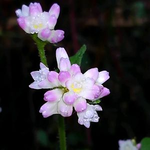① ミゾソバ/溝蕎麦 タデ科 イヌタデ属 原産地:在来種 (北海道、本州、四国、九州) ・山野草 ・一年草 ・草丈:30-100cm ・花期:7-10月 ・花:頭状花序に10~20個集まってつく ・花被:長さ3-4mm ・花色:ピンク色~白色、先の紅色が濃く、5深裂する ・花被片:長さ3-4mm ・果期:8-10月 ・果実:痩果 長さ3-3.5mm 3稜形 ・果実の色:緑白色~黄白色、光沢はない ・別名:ウシノヒタイ 花言葉:「純情」「風変わり」「思いやり」 ·͜·ᰔᩚ 今季初 ② メイゲツソウ/明月草 タデ科 イタドリ属 原産地:在来種 (北海道、本州、四国、九州) ・パイオニア植物 ・高山性植物 ・雌雄異株 ・山野草 ・多年草 ・草丈:30-100cm ・花期:8-9(6-9)月 ・葉:長さ5-15cm、幅3-8cm 卵形 ・花:長さ2.5mm ・雌花色:淡いピンク※ 咲き進むと萼は紅色になる ←此方の掲載画像は、淡いcoral(植木ペディア) ・花柱:3個 ・雄花色:白 ・雄しべ:8個 ・花色:紅色、薄い赤、白 ・別名:ベニイタドリ(紅虎杖) 花言葉:「回復」「見かけによらない」 ·͜·ᰔᩚ 初めまして ③ ポントクタデ/凡篤蓼 タデ科 イヌタデ属 原産地:在来種 (本州、四国、九州、沖縄) ・山野草 ・一年草 ・草丈:40-100cm ・花期:8-9月 ・果期:9-10月 ・葉:互生し、披針形~長楕円状披針形で、長さ5-10cm、幅1-2.5cm 先は鋭尖形、基部は細まる ・両面脈上に短い伏毛があり、中央に八の字状の黒班がある ・辛味はない ・花:茎頂や葉腋に、長さ5-12cmの穂状の総状花序となって疎らにつき、先は垂れる ・花被:下部は緑色、先は淡紅色、長さ約3mm、4~5深裂する。腺点がある ・果実:痩果 3稜形の卵形、長さ2.5-3.5mm、褐色か黒色で光沢はない ・別名:ケボントクタデ 花言葉:「君を離さない」「愛くるしい」 ·͜·ᰔᩚ 初めまして ④⑤ エゴノキ エゴノキ科 エゴノキ属 原産地:在来種 (北海道、本州、四国、九州、沖縄) ・落葉高木 ・樹高:10-15m ・花期:5-6月 ・果期:9-10月 ・葉:互生し、長さ4-8cm 卵形、先が尖り、基部は楔形、縁に浅い鋸歯がある ・花径:2-2.5cm ・果実:蒴果 長さ約1㎝の卵球形 灰白色 ・種子:果実に1個 褐色 ・別名:チシャノキ、ロクロギ、オオバエゴノキ、シマエゴノキ、ホソバエゴノキ、ヒメエゴノキ 花言葉:「壮大」「清楚」