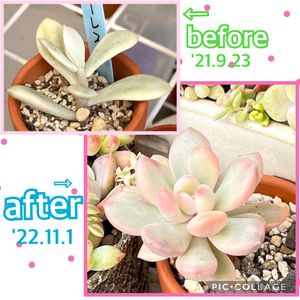 🍀 トーレス錦 🍀 パクさん苗 ↖️去年友達がプレゼント🎁してくれた 葉挿しっ子 ↘️1年でこんなに変身しました💖 プレゼントしてくれた友達も喜んでくれて💓 私もこんな可愛い苗になるとは想像もしていなかった😆 もっと葉数が増えたら胴切りして もっともっと増やしたいなぁ〜💕💕