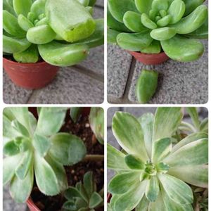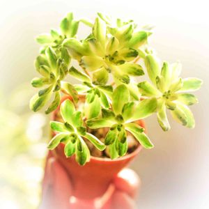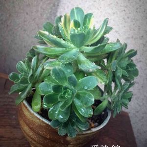 アエオニウム 愛染錦(あいぜんにしき) 斑入りの葉っぱなのにこのコだけ 全体にクリーム色で目を引きます😍 初の冬越しだけど無事に春を迎えられるかな?😅