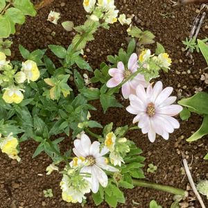 挿し木床で花が咲いてしまいました。 オスティオスペルマムとネメシア その隣には小さな百合の赤ちゃん球根を埋めていたら、成長して花の蕾が付いています。