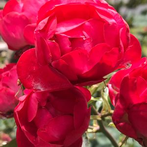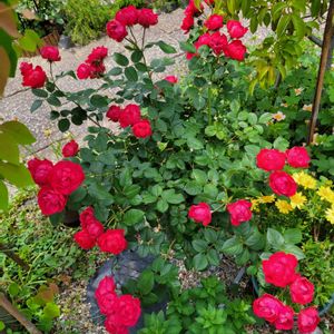 こんにちは♪ 今日も午前中でも暑いですぅ🥵 水遣りも汗ばむことに…。 チェリーボニカ、スマホでは本来の赤が表現しづらいですね。肉眼では、もっと落ち着いて充実した赤なんですけどね😀 隣で蕾をつけた百合が邪魔するので、棒で避けてるんです。花首を結えて見えるのが残念な感じ😅