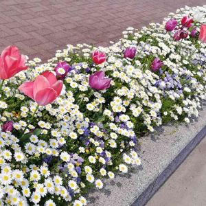 私の好きな花壇のお花です。ノースポール、チュウリップ。何処までも続いてきれいです。