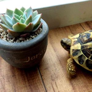 我が家のラウリンゼ4号さんと リクガメのリクさん。 今のとこ多肉とサボテンはエサとは認識していないみたいで興味なし〜😊