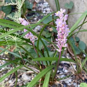 ヤブラン🌸 キジカクシ科 多年草 別名 サマームスカリ 家の裏に涼しげな花色で咲いています💕草丈30cmの葉っぱも風に揺れるとすこーし秋の訪れかな🤗