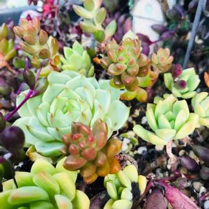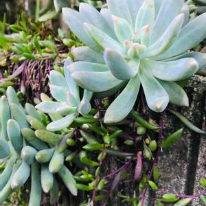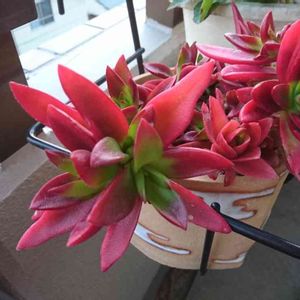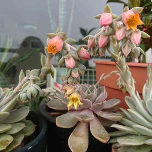 今晩は😃🌃 こんな時間に、失礼します。 お昼に投稿しようと思っていたのですが、あまりの睡魔に、爆睡してしまいました。 それでこんな、時間に、………… 多肉お花、オンパレード 右側はローラ 真ん中は分からないので教えて下さい。左側はデレッセーナ さゆけんちやんにピンクプリティと教えていただきました。