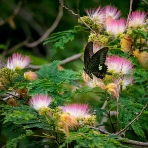 撮影地:四季の森公園 ネムノキの花にモンキアゲハが来ていました。 黒系のアゲハ蝶は、ネムノキの花が好きで、よく飛来します。