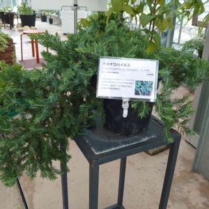 沖縄花と食のフェスティバルにて。 オキナワハイネズ。盆栽風。海岸の砂地に自生している針葉樹だそう。小笠原諸島に自生するシマムロ(=ネズ Juniperus taxifolia)という低木の変種。初めて見た。問題は置き方。