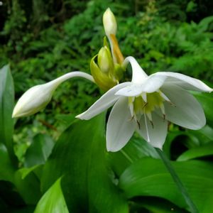 「アマゾンユリ」 別名→アマゾンリリー・ギボウシズイセン ヒガンバナ科 ✳︎純白で引き立ちますが、下向きには咲く ※花言葉→清々しい日々 咲くやこの花館 1/12