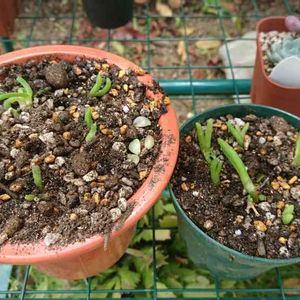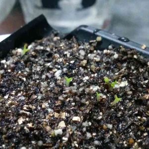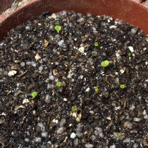 モニラリア 実生。 腰水はもう止めてるんだけど、大丈夫なのか心配。 でもひとつ溶けちゃったから、少しずつ乾かし気味管理へ移行した。 夜に霧吹きしている。 そしたらなんか出てきてる。 なんの芽!?