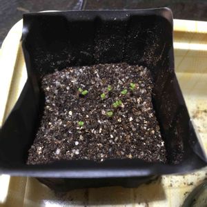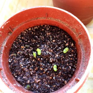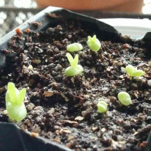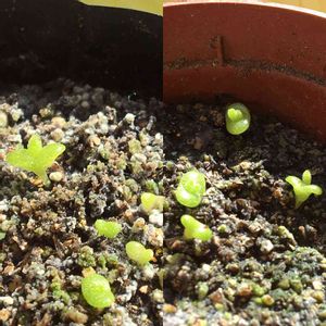 2017.1.24 モニラリアオブコニカの種を蒔いて、39日目 2日で芽が出てそれから脱落者が出たり紆余曲折ありましたが、ついに双葉の間からウサギの耳が生えてきた♡まだよくわかんないけど、もう2、3日したらハッキリ見えるはずー(´◡`๑)可愛すぎるー♡