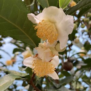 茶の木(チャノキ) ツバキ科ツバキ属の常緑低木。奈良時代に中国から渡来し、野生化して山の林にも見られる。花期は10~11月。白い5~7花弁が沢山の黄色い雄しべを包むように下向きにつく。観賞用に淡紅色の花をつけるベニバナチャがある。果実は蒴果。径2㎝ほどの偏球形。翌年の秋に熟して3裂し種子を落とす。種子はほぼ球形で2~3個。 飛鳥時代から奈良時代に遣隋使や遣唐使によって伝えられた茶は、平安時代、唐に留学した最澄、空海が種を持ち帰り、鎌倉時代に宋に留学していた栄西が喫茶習慣を伝え、禅寺で茶の木が栽培されるようになったとされる。本種の若葉を摘んで加工したものが緑茶で、全国各地で栽培される。紅茶やウーロン茶はおもに製法の違いで、植物の種としては同じもの(変種)を用いている。 出典『里山の花木 ハンドブック』『樹木の名前』