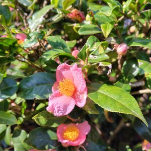 ☀️快晴 無風 🏯名古屋城へ ①サザンカ ②茶の花 ③犬槙の実 今日は無料の日、イベントと好天に誘われて?か人人人だらけ。 行列待ちが苦手なので、、名古屋城本丸御殿には中々入れない、又次の機会にと先送り💦 庭園の茶室傍、サザンカは薄桃で一重咲き。清楚なのに高尚!? 茶の花は小さく俯きかげんが愛おしい♡ 犬槙の実はかわいくて、、遠い昔に遊んだ事、懐かしい🎶♡