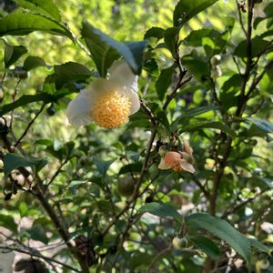 5月2日 今日のお花 💚🤍💛チャノキ 💛🤍💚 鎌倉時代に栄西が中国からタネを持ち帰り栽培が始まる。花は下向きに咲き黄色い雄しべが目立つ。 花色 白 花期 10〜11月 ①② 2024.12月 撮影 ③ 2024.10月 撮影
