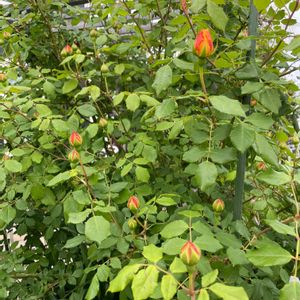 爽やかな空の下、こちらのツルバラも1番花が咲きました