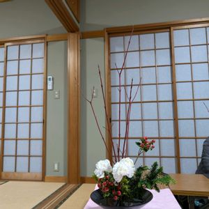 あけましておめでとうございます 本年も宜しくお願いします ①お正月花生けました ②前々回に投稿したクリスマスリースの一部をしめ縄飾りに
