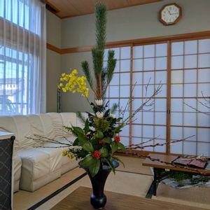 🎍明けましてお目出度うございます🎍 お正月の花 立花です🏜️🌺🪴🌺💖❤️🌹 清楚で目出度い花です🌺 松 梅 白菊 オンシジュウム クジャクヒバ 千両 赤目柳 小菊 シダ 今年も1年良い年で有ります様に願いを込めます🏜️🪴🎍 宜しくお願いします🙇