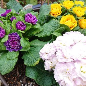 ひと株で美味しい二色の花が咲いてます 💖Happy birthday💖 昨日二十歳のお誕生日を迎えた花友さんに贈ります いつも元気をありがとう‼️ いつまでも可愛い貴女でいて下さいね🥰 プリムラベラリーナ サクラソウ科の宿根草で八重咲きです −5° 迄の耐寒性 さあ、今年の夏越しに挑戦です
