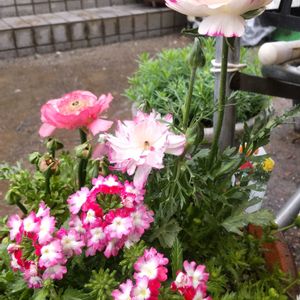 ホムセンパトロールです。😃☺️💮 季節終わりで幾つかお迎えです。 寄せ植えしました。 ラナンキュラス¥140 花色彩バーベナオブセッションツイスター ¥138 ルピナス¥ 120 他、ペチュニア ライトピンク¥98 を3ポット購入 こちらは 夏の準備で花芽は全て取り除きました。😃☺️💮