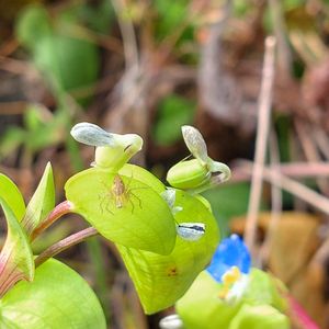 もうひとつツユクサです 青い花弁は溶けてしまった後なのかなぁ もしかして…蕾かも?(12日追記) 遠目に見ると小さなウサちゃんᕱ⑅︎ᕱが… ツユクサの葉っぱの上を 駆けている様に見えました 更に良く見ると小さな蜘蛛さんが🕷 何か物語が見えて来そうですね~💭 いかん つい妄想癖が…😱 p